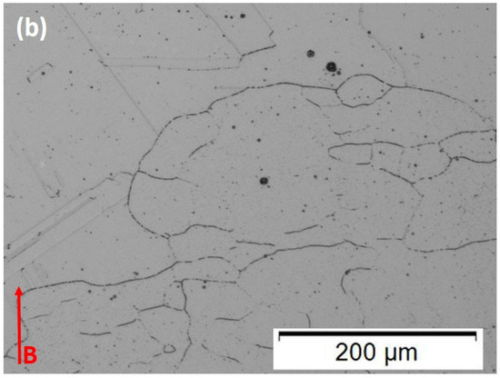 Heat-treated samples. Magnified images. (a) 50 µm, layer thickness; (b) 100 µm layer thickness. B denotes the build direction.