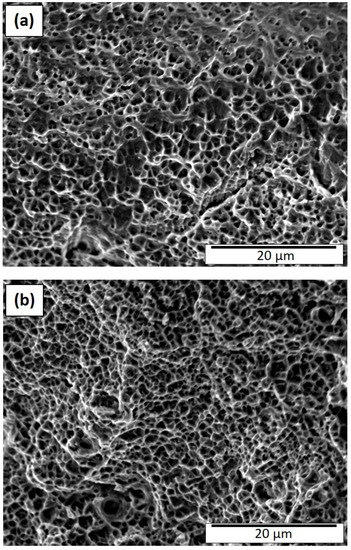 The ductile fracture features shown in Figure 8a,b for the heat-treated 50 µm and 100 µm layer built components are more homogeneous and characteristic of regular grain structures. Dimple sizes in Figure 8a range from ~0.6 to 3 µm while those in Figure 8b range from ~0.4 to 4 µm, although the average dimple sizes were ~2 µm and 1.5 µm, respectively; the latter including the duplex grain structure which tends to average over the fracture surface. Simply looking closely at the images in Figure 8 can allow a correlation between the corresponding yield stress values of 340 MPa and 581 MPa, respectively, as shown in Table 3. The very similar elongations characteristic of Figure 8a,b of 64% and 65%, respectively, also attest to the dimple similarities. Aside from the somewhat anomalous behavior for the duplex grain structure represented in Figure 5b and Figure 8b, the fracture features generally follow those for a range of alloys where overall dimple size increases when the yield stress decreases [37,38,39].