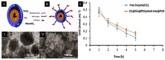 (A,B) Schematic illustration of immobilized enzyme; cellulase (CEL) immobilized glutamic-acid-functionalized magnetic gold mesoporous silica nanoparticle core shells (CEL@Glu@PEGylated mAu@PSN). (C,D) TEM/SEM images of Glu@PEGylated mAu@PSNs. (E) Change in enzymatic activity of free and immobilized cellulase with time at pH = 4.8 and 50 °C. Reproduced from [53] with permission from Elsevier.