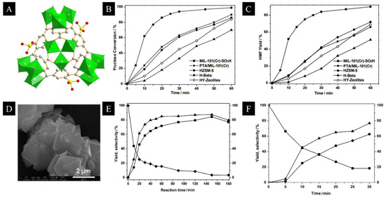 (A–C) Structure of sulfonic-acid-functionalized MOF as catalyst: MIL-101(Cr)-SO3H for conversion of fructose into HMF, the fructose conversion over time and HMF yield against time. (D) SEM image of catalyst prepared by adsorbing phosphotungstic acid (PTA) in MIL-101 MOF, (E) yield and selectivity over time for fructose dehydration using (PTA)-MIL-101 in 1-ethyl-3-methlyimidazolium chloride at 80 °C; square, diamond and triangular points indicate fructose retention, HMF yield and HMF selectivity, respectively (F) yield and selectivity over time for fructose dehydration using (PTA)-MIL-101 in DMSO at 130;square, circular and triangular points indicate fructose retention, HMF yield and HMF selectivity, respectively. Reproduced from [58,59] with permission from John Wiley and Sons and the Royal Society of Chemistry.