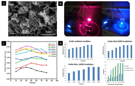 (A) SEM image of prepared g-C3N4 nanoparticles used to increase bioethanol production. (B) Irradiation using blue and red laser to increase bioethanol production from potato waste. (C) Effect of ZnO nanoparticles on bioethanol yield from rice straw. (D) Effect of various processing conditions of g-C3N4 nanoparticles on the production of bioethanol. Reproduced with permission from [124] Springer Nature and [125] Elsevier.