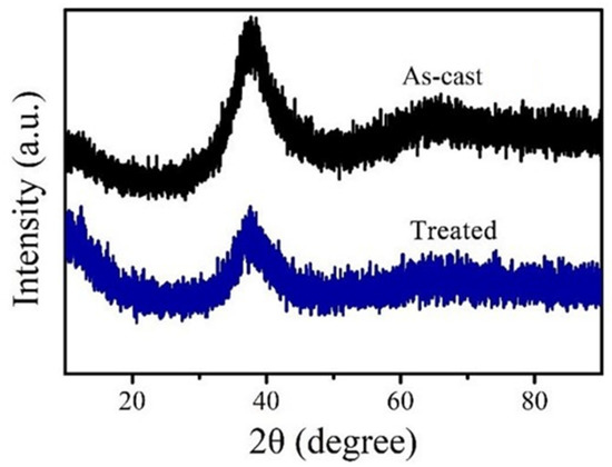 XRD patterns of Zr54.46Al9.9Ni4.95Cu29.7Pd0.99 BMGs before and after HRRF treatment [17].