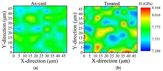 (a,b) are the distribution of the nano-indentation hardness of the as-cast [17] and treated sample, respectively.