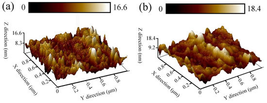 It is well known that roughness of pre-tested surfaces would interfere with the friction properties of BMGs [21]. Therefore, before friction tests, AFM are used to evaluate pre-tested surfaces. The micro-morphology, pre-tested surfaces of the as-cast and treated BMGs are analyzed by AFM as illustrated in Figure 3a,b. It is intuitively found that all pre-tested surfaces exhibit the interlaced topography of “peak” and “valley” on the pre-tested surfaces. Significantly, the relative width of the pre-tested surface roughness for the as-cast glass is 16.6 nm, much the same as that (18.4 nm) in the treated sample. Moreover, by further calculation, the average surface roughness of pre-tested surfaces (Ra) of the cast sample is 4.61 nm, and the Ra of the treated sample is 4.9 nm. Such tiny changes suggest that the pre-tested surfaces exhibit ideal flatness, minimizing the effect of the surface roughness of pre-tested surfaces on the accuracy of friction experiments.