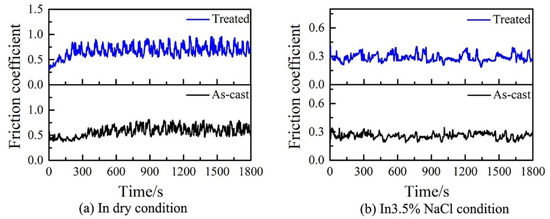 As shown in Figure 2, HRRF could enhance the microstructural heterogeneity of Zr54.46Al9.9Ni4.95Cu29.7Pd0.99 BMGs. Thus, the as-cast and treated BMGs were tested for wear resistance. Figure 4 presents the friction coefficient curves of as-cast and treated BMGs under dry conditions and 3.5% NaCl solution. As described in Figure 4a, it was found that both curves have a steady-state stage after an initial rapid increasing period under the dry-friction condition; the coefficients of friction in the steady-state stage are ~0.578 and ~0.676 for as-cast and treated samples respectively. The treated BMG displays a higher friction coefficient (COF). This phenomenon may be interpreted as that during the friction experiment, the harder regions in treated BMGs can remain intact for a long time, which increases the relative movement resistance between the material and the friction pair [22]. However, in Figure 4b, under the 3.5% NaCl solution condition, the friction coefficients of all samples exhibit around 0.29, and much lower, values than those in the air condition, owing to the lubrication effect of the NaCl solution.