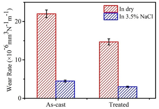 The wear rate is always regarded as an important parameter to evaluate the wear resistance of the materials [6,23]. Thus, the wear rate of as-cast and treated BMGs under dry and 3.5% NaCl solution are illustrated in Figure 5. The wear rates of as-cast BMG and treated BMG in dry are 22.1 × 10−6 mm3·N−1m−1 and 14.7 × 10−6 mm3·N−1m−1, respectively. In addition, the wear rates of BMGs sliding in 3.5% NaCl solution decreased in the following order: 4.5 × 10−6 mm3·N−1m−1 for the as-cast BMG, and 3 × 10−6 mm3·N−1m−1 for the treated BMG. Evidently, the values of wear rates of as-cast samples show remarkably higher values than those of the treated samples under different conditions.