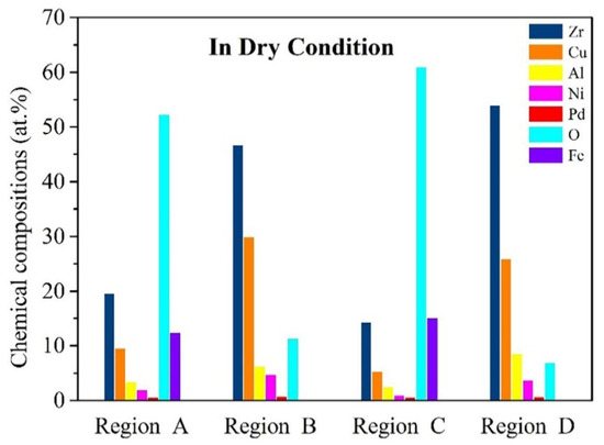 In addition to the worn surface morphology, the residual elements on the worn surface, which come either from the surrounding environment or the counterpart, are also an important basis for understanding the friction process [31]. Therefore, a SEM-EDS experiment was carried out. Figure 8 shows the SEM-EDS point spectrum of wear debris regions (marked by A in Figure 6b and C in Figure 6d and BMG matrix regions (marked by B in Figure 6b and D in Figure 6d). The Figure 8 shows that the oxygen appears on the worn surfaces of all samples, which confirms our previous supposition that surface oxidation takes place during the friction process [32]. Further observing BMG matrix regions, the oxygen content of the as-cast sample is 11.4%, while the treated sample is just 7%, suggesting that harder regions make it more difficult for the treated samples to participate in the oxidation reaction. Whereas as shown in wear debris areas, it is interesting to note that both as-cast and treated samples exhibit a larger amount of oxygen (over 50 at%) and the iron element, indicating that the wear debris would not only react violently with oxygen in the air, but also cause material transfer between BMGs and friction pairs. Furthermore, by comparing the variation in the chemical compositions of region A and region C, the oxygen content of wear debris increased from 52.3% in the as-cast BMGs to 61.3% of the treated sample, and the Fe content increased from 12.5% in the as-cast state up to 15.2%, contrary to the tendency of BMG matrix regions. This may be explained by the wear debris materials from the soft regions of worn surfaces; greater softness of the soft regions for treated BMGs results in their wear debris being more inclined to actively participate in the reaction.