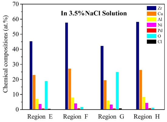 As illustrated in Figure 9, the EDS analysis was performed under 3.5% NaCl solution on wear debris regions (marked by E in Figure 7b and G in Figure 7d) and BMG matrix regions (marked by F in Figure 7b and H in Figure 7d). It is obvious that the extremely low content of oxygen on the as-cast and treated BMG matrix regions is less than 2%, showing that the NaCl solution can reduce friction heat effectively, which minimizes the probability of an oxidation reaction on the friction surface [31]. Moreover, the chlorine element was not detected in this area, indicating that the corrosive effect of chloride ions could not have a significant impact on this area. Conversely, when observing the point scanning results of the wear debris regions, it is worthwhile to note the higher oxygen content and the appearance of chlorine elements. This implies that the wear debris is more easily oxidized and corroded as well, under the 3.5% NaCl solution. Furthermore, the contents of O and Cl on the wear debris of as-cast samples are both lower than the treated samples.