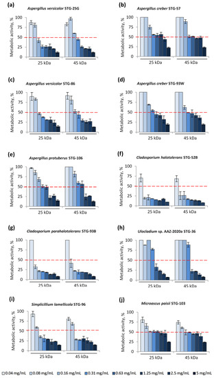 The effect of chitosans on the metabolic activity of test cultures was quantified as a percentage of the MA of the strain on a potato dextrose broth (PDB) with chitosan compared with the growth of fungi on the control medium by the modified tetrazolium method (MTT test). As test cultures, 10 representatives of filamentous fungi, which are known to have biodeterioration activity against organic materials used in tempera painting of the 15–16th centuries, were used [30]. Five species of fungi were from the family Aspergillaceae (Aspergillus versicolor STG-25G, A. creber STG-57, A. versicolor STG-86, A. creber STG-93W, A. protuberus STG-106), two species were from the family Cladosporiacea (Cladosporium halotolerans STG-52B, C. parahalotolerans STG-93B) and one representative each from the families Pleosporaceae (Ulocladium sp. AAZ-2020a STG-36), Cordycipitaceae (Simplicilium lamellicola STG-96) and Microascaceae (Microascus paisii STG-103). These strains were dominant among the entire microbiome that could be found in STG and were documented by metagenomic profile characterization [30]. Assays were carried out for chitosans with a MW of 25 kDa and 45 kDa, which showed the highest activity in previous experiments on fungal growth inhibition (FGI) with a fixed concentration of chitosans in CDA medium [45]. Inhibition of fungal metabolism was assessed using the concept of EC50, which corresponds to 50% inhibition of MA (Figure 1).