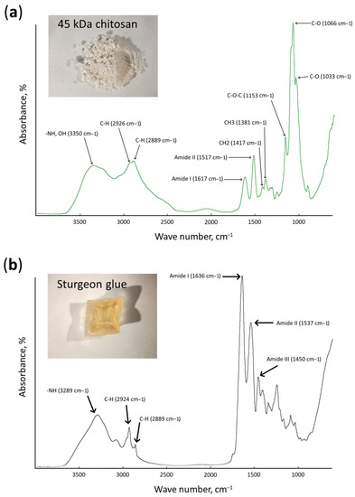 FTIR spectra of initial raw materials: (a)—chitosan with MW 45 kDa; (b)—sturgeon glue.