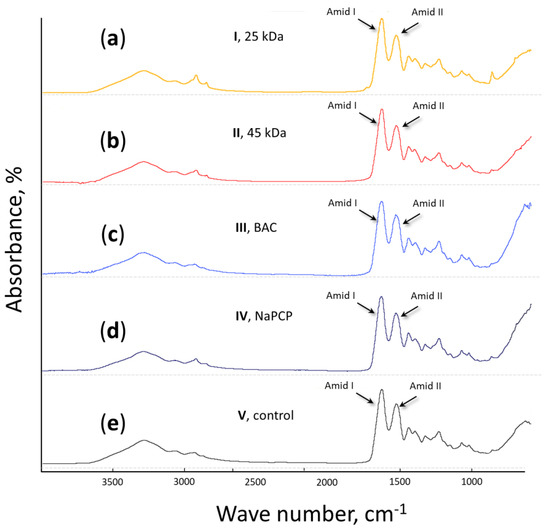 To characterize the effect of chitosan additives on the spectral characteristics of the obtained mock-up layers, we performed an FTIR analysis of initial raw materials, sturgeon glue and LMW chitosans, and composite materials, mock layers No. I–No. V (Figure 3, Figure 4, and Figures S1 and S2). It turned out that the FTIR spectra of all mock layers (No. I–No. V) were very close to the original spectrum of sturgeon glue (Figure 3b and Figure 4). The addition of 1% standard antiseptics such as BAC or NaPCP (to mocks layers No. III and No. IV, respectively) did not make a significant difference compared to the control mock layer No. V (Figure 4c–e). Additionally, the introduction of 1% LMW chitosans into the composition of the mock-up material does not have a detectable effect on FTIR spectra compared to the control (Figure 4a,b,e).