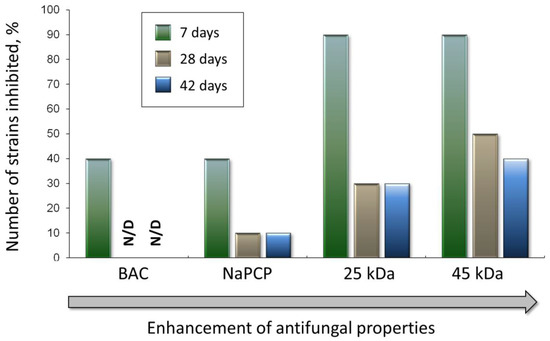 The percentage of completely inhibited fungal STG microbiome (among the 10 studied strains) at 7, 28, and 42 days after inoculation on mock-up layers with the addition of selected antifungal compounds: 25 kDa—chitosan with MW 25 kDa; 45 kDa—chitosan with MW 45 kDa; BAC—benzalkonium chloride; NaPCP—sodium pentachlorophenolate. N/D—not detected.