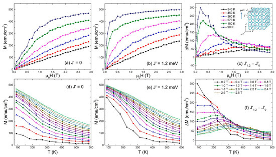 At first, the magnetization behaviors with increasing μ0H at selected T for J′ = 0 and 1.2 meV are studied with the results presented in Figure 1a,b. With the increasing μ0H, the magnetization increases monotonically. At high T, a roughly linear increase in magnetization with μ0H is observed, while at low T, the magnetization increases rapidly under low μ0H and slowly under high μ0H, indicating the occurrence of a magnetic phase transition from superparamagnetic to ferromagnetic state with decreasing T. The high-T magnetization behaviors for J′ = 1.2 meV are similar to those for J′ = 0 at the same T, while at low T, the magnetization for J′ = 1.2 meV rapidly increases under lower μ0H and the magnetization under high μ0H is more approaching to the saturation value as compared to J′ = 0. In order to highlight the role of J′ on the magnetization behavior with μ0H and T, the magnetization difference (∆M) between J′ = 0 and 1.2 meV under the same μ0H is given in Figure 1c. With the decreasing T, the maximum value of ∆M is enhanced; meanwhile, the ∆M peak moves to the lower μ0H, indicating that the large ∆M can be obtained by J′ at low T and intermediate μ0H. On the other hand, the magnetization behaviors for J′ = 0 and 1.2 meV as well as ∆M with T under selected μ0H are shown in Figure 1d–f. The magnetization value for J′ = 1.2 meV at low T is commonly higher than that for J′ = 0 at the same T, and thus with decreasing μ0H, the maximum value of ∆M increases meanwhile the ∆M peak moves to the lower T.