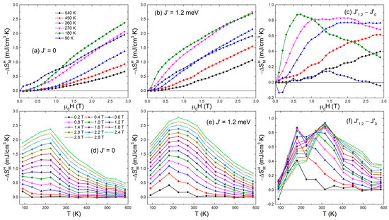 Based on the magnetization results, is calculated and its behavior with μ0H and T is depicted in Figure 2. With the increasing μ0H, increases monotonically at a given T. For J′ = 0, the largest value of under low μ0H (<1 T) is obtained at T = 90 K, while under μ0H (>1.1 T) obtained at T = 180 K. Similarly, the largest value of for J′ = 1.2 meV under low μ0H (<2.5 T) is obtained at T = 180 K, while under higher μ0H obtained at T = 270 K. Furthermore, under the same μ0H, for J′ = 1.2 meV is commonly larger than that for J′ = 0. The difference in exhibits a plateau between 0.7 and 0.8 mJ/cm3·K with μ0H at T = 270 K, while it exhibits a peak at low T, e.g., the highest difference of (~0.9 mJ/cm3·K) is obtained under μ0H = 0.7 T at T = 180 K. With the further decreasing T down to 90 K, for J′ = 1.2 meV decreases, and as a result, the difference of between J′ = 0 and 1.2 meV is smaller than 0.2 mJ/cm3·K. On the other hand, the behavior with T is commonly nonmonotonic under a given μ0H, and with increasing μ0H, the peak of moves from T = 100 to 225 K for J′ = 0 and from T = 180 to 225 K for J′ = 1.2 meV. At the same T and μ0H, for J′ = 1.2 meV is larger than that for J′ = 0, and the high difference of appears at T = 180 K under low μ0H (≤1 T) and at T = 315 K under high μ0H (≥1.4 T). Remarkably, the high μ0H can induce the large , and the peak of commonly appears at room temperature close to the magnetic phase transition temperature, e.g., Curie temperature. In the systems where J′ is taken into account, not only the temperature where the peak of appears becomes controllable, but also the values involving the peak value can be highly enhanced (up to the ~1.3 times enhancement of from J′ = 0 to 1.2 meV).