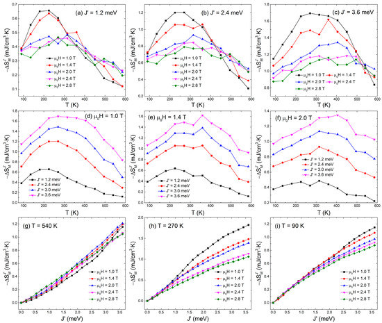 Remarkably, the variation of J′ induces the magnetization change at given μ0H and T, which has been well interpreted by the molecular field theory, and thus Equation (5) should be valid, i.e., the modulation of J′ can cause the conversion from magnetic energy to thermal energy via the internal exchange interaction controllable magnetization change. Figure 3 presents the results of with T and J′ under selected μ0H. With the elevating T, is also nonmonotonic, e.g., for J′ = 1.2 meV, the peak value of reaches ~0.65 mJ/cm3·K under μ0H = 1 T and appears at T = 225 K. Interestingly, the strong μ0H can suppress , opposite to the results of vs. μ0H. Moreover, with increasing J′, the T range of the large becomes widened. At a given T and μ0H, the larger the J′ value is, the larger the value that is obtained. The sensitivity of with J′ to the μ0H depends on T, and the highest sensitivity is found near 270 K, as shown in Figure 3. The results indicate that is monotonically enhanced by increasing J′ while suppressed by applying strong μ0H, and exhibits a peak or a plateau at intermediate T, which implies that the energy competition among exchange interaction, magnetic field, and temperature determines the behaviors.