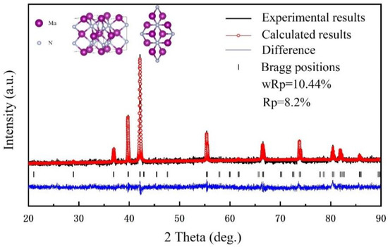 Mn is an element with abundant electronic and spin states that can enrich the properties of compounds formed with light elements. Compounds of Mn with N can be classified into four categories: θ (MnN), η (Mn3N2), ε (Mn4N), and ζ (Mn5N2, Mn2N, and Mn2N0.86) [15]. MnN and Mn3N2 are antiferromagnetic with Néel temperatures of 650 K [16] and 927 K [17], respectively. Mn4N has two inequivalent manganese sites in different positions, which causes ferrimagnetism [18]. Mn2N0.86 has been studied both experimentally and theoretically [19,20,21,22,23], although conflicting results were obtained. An in-depth understanding of Mn2N0.86 might help us to understand Mn2N0.86-based catalytic processes [24] and electronic materials [25]. In some studies of compounds consisting of manganese and other light elements [26], the characteristic antiferromagnetic curve was not observed upon the application of an external magnetic field. A study of fine Mn-N was therefore expected to enrich our knowledge and deepen the understanding of the characteristics of these compounds.