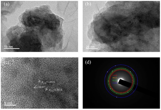 The surface morphology of the sample and the distributions of Mn and N in the samples were examined with SEM and EDS (Figure 2). The quality of the originally synthesised sample was poor in that it was excessively porous and poor crystallinity, which we ascribed to the thermal decomposition of the raw material NaN3 to form N2. A second sintering process was therefore introduced in an attempt to enhance the quality of the original products. As shown in Figure 2c,d, no obvious pores are visible, and the homogeneity and densification improved. In addition, the EDS analysis of the elemental distribution in the samples after the second sintering indicated that the Mn and N atoms were more evenly distributed, and Na was not detected, as shown in Figure 2e,f. This seemed peculiar considering that NaN3 is an important reactant, and the fate of the Na was not immediately clear. Upon closer inspection with the aid of XRD analysis, we found NaO and NaOH in the BN capsules, which means that the BN capsules absorbed the Na atoms from the reactants during the synthesis. This is quite different from other metathesis reactions, such as the formation of CrN [13,14], VN [13], IrN2 [31], and OsN2 [31]. This difference might be attributed to the N concentration of the product being relatively low and to the fact that the molar ratio of Na is sufficiently low for it to be completely adsorbed by the BN capsules. Therefore, there might be a critical concentration of Na in the metathesis below which the product does not contain any Na. The further characterization of the samples with TEM gave the selected electron area diffraction (SAED) patterns in Figure 3d. The observed circular SAED pattern suggests that the synthesized specimen is of polycrystalline nature. The inter-planar distances calculated from the crystal lattice fringes of high-resolution TEM (HRTEM) shown in Figure 3c are 1.281 Å and 1.207 Å, which correspond to the distances of planes (113) and (220). Meanwhile, the observations of the HRTEM are in line with the measured peaks of the XRD patterns.