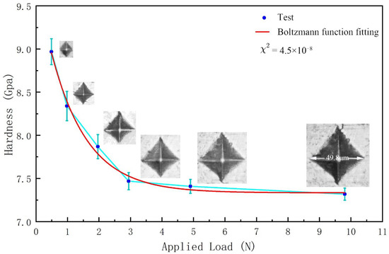 Vickers hardness for Mn2N0.86. The applied load ranged from 0.49 N (low load) to 9.8 N (high load). Typical optical images of the indentation are shown in the inset.