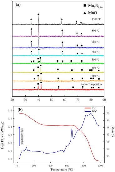 Variable-temperature XRD test data and TG-DSC test data of the samples. (a) Variable-temperature XRD test data: The black rectangles mark the Mn2N0.86 characteristic peaks, and the black triangles mark the MnO characteristic peaks. (b) TG-DSC curve of the sample: The red line is the TG curve, and the blue line is the DSC curve.