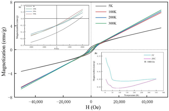 We recorded the magnetic hysteresis curves at different temperatures with a field sweep from −50 kOe to 50 kOe (Figure 6, with the inset (b) showing the FC and ZFC curves. The hysteresis decreases with increasing temperature, and the FC curve does not coincide with the ZFC curve. This led us to speculate that ferromagnetism and antiferromagnetism coexisted in the sample simultaneously. This did not correspond with the results from previous studies in which the prepared samples were not single-phased, and the researchers attributed the occurrence of both types of magnetism to impurities [22].