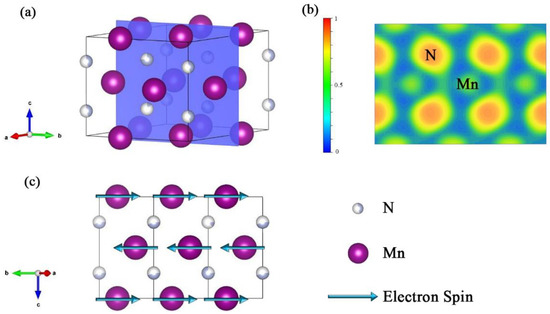 (a) The cutting slab of Mn2N0.86 along the (100) plane. (b) ELF of Mn2N0.86 2D display for (100) plane. (c) Magnetic structure of Mn2N0.86 projected.