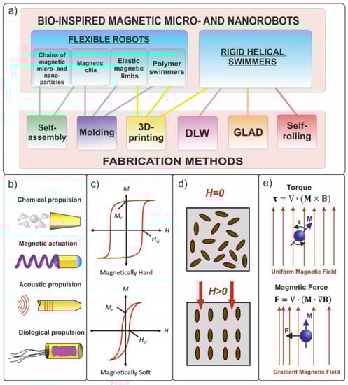 (a) Approaches to the fabrication and control of magnetic microrobots. (b) Methods for actuating biomimetic micro- and nanorobots. (c) Dependence of magnetization on the external magnetic field for hard and soft magnetics. (d) Schematic representation of a polymer with magnetic particles cured without and in the presence of a magnetic field. Reproduced from [24]. CC BY 4.0. (e) Movement of magnetic object in a uniform and non-uniform magnetic field.