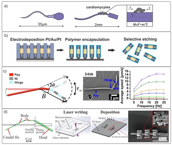 Previously, completely inorganic magnetic (Co80Ni20, d = 200 nm) artificial spermatozoa with a flexible polymer (SU-8) tail were proposed (Figure 10a) [74]. The maximum propulsion speed of the fabricated samples with a body length of 322 µm reached 158 µm/s at a magnetic field frequency of B = 5 mT.