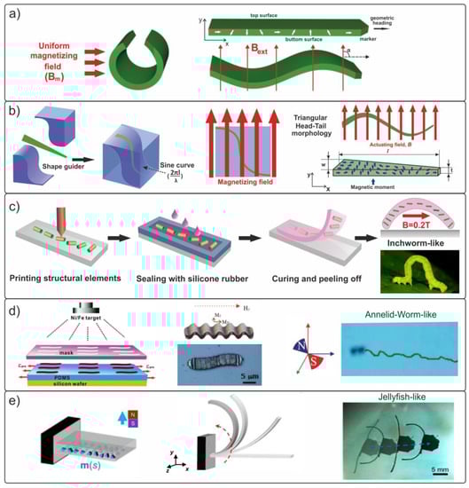 (a) Schematic representation of the programming method for the magnetic structure and the resultant sinusoidal magnetization profile of the designed millimeter-sized swimmer. (b) Procedure of magnetization along a preset profile in the shape guider and control of a triangular silicone swimmer by an external magnetic field. (c) The process of formation of inchworm millimeter-sized magnetic robots using a 3D printer with fused deposition modeling and molding in silicone. (d) Schematic representation of the manufacturing process of a magnetic annelid-worm-like microswimmer and its propulsion in a magnetic field [78]. (e) Schematic representation of the beam bending under the action of an external magnetic field and the movement of the millimeter-sized swimmer in water, simulating the movement of a jellyfish [108].