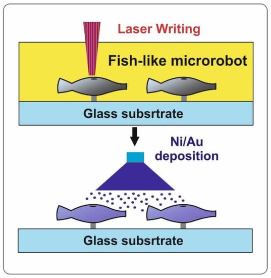 In a recent publication, researchers proposed a unique dual-driven biomimetic structure propelled by infrared light and magnetic field [75]. The microfish body was fabricated from biocompatible SU-8 photoresist using rapid 3D printing technology (DLW) (Figure 4). Then, the deposition of functional Ni and Au nanoparticles was performed for magnetic and optical control, respectively. When controlled using a magnetic field gradient, the average translational velocity of the artificial microfish reached a value of 220 µm/s (2.4 body lengths per second) in deionized water. The micromovement of the robot, due to the heating of its body during the absorption of infrared light and the occurrence of thermal convection flow, was also demonstrated in this work. The ability to move at high speeds under magnetic control and with precise movement under optical control in microfluidic channels under harsh fluid conditions has been demonstrated. The proposed structure with dual control opens up various opportunities for the development of intelligent micromotors that can reconfigure their movement mode depending on the problem being solved and environmental conditions.