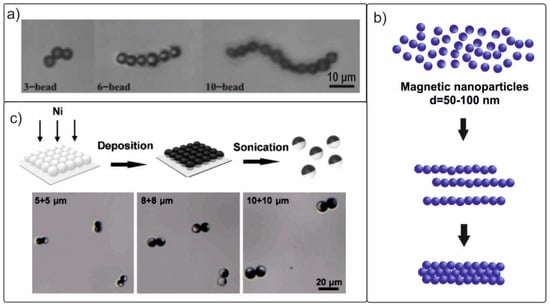 (a) Photos of microswimmers of various lengths collected from chains of microparticles in a magnetic field. Reproduced from [83]. CC BY 4.0. (b) Three-stage formation of micro- and nanoswimmers based on iron oxide nanoparticles. (c) Design and manufacturing steps of magnetic microdimer swimmers and an optical image of Janus microdimers after magnetization. Reproduced from [85]. CC BY 4.0.
