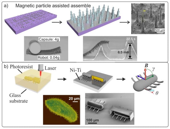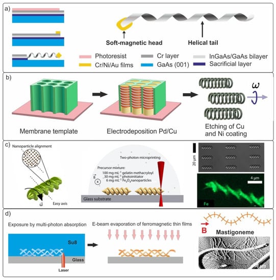 All of the above methods make it possible to form three-dimensional robots down to the nanoscale; however, they suffer from limitations concerning the complexity of shape and materials. The first four methods make it possible to form objects of a simple shape directly from magnetic composites, such as various protrusions, helices, cylinders, and rings.
