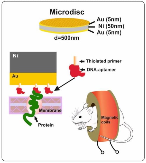 Today, numerous magnetic nano- and microstructures are widely used for the magnetomechanical noninvasive destruction of oncological cells [145]. Paper [69] describes Au-coated nickel magnetic disks, 500 nm in diameter, fabricated using nanoimprint lithography (Figure 12). The nanodisks had a magnetic moment perpendicular to the disk plane that prevented them from sticking together. For selective action on carcinoma cells, special functional aptamers were attached to the Au surface of the nanodisks, which ensured that the disk was attached to the cancer cell membrane only. Under the influence of an alternating magnetic field, the mechanical oscillation of the microdisk leads to the cell destruction. This work demonstrates an efficient therapy for mammary adenocarcinoma in mice using a 100 Hz alternating magnetic field of 10 mT applied for 10 min.