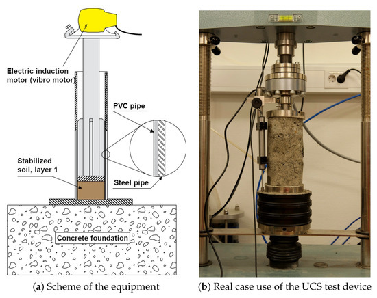 The Uniaxial Compressive Strength (alternatively: Unconfined Compressive Strength) (UCS) test is a straightforward and relatively easy method to evaluate the enhancement of strength and stiffness in stabilised soil over time. Because it well reflects both compaction properties and gained strength, it is one of the most frequently used and commonly acceptable methods to evaluate the engineering properties of the stabilised soil, as continuously reported in earlier papers [40,41,42,43]. The examples of using the UCS tests are diverse and include, for instance, the improved methods testing bearing capacity and settlement of cohesive soil in the foundation of buildings [44]. Some more advanced methods include predictive modelling by programming techniques to estimate the UCS [45], using artificial intelligence methods [46,47,48] and machine learning applications [47,49] to UCS estimation. Almost all previous UCS-based soil testing techniques have been restricted to existing workflow using traditional binders. However, the major disadvantage of the UCS method consists in its destructive nature, since it crushes the tested sample during the experiment.