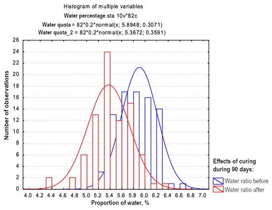 Target water ratio for the stabilised material was 5.8% when binder was included. The histogram in Figure 3 illustrates the mean pre-storage of 5.89% with a standard deviation of 0.307; after curing the mean was 5.37 and the standard deviation −0.359, which indicates that the target value was achieved. The variation in water content was not greater than expected, which depends, i.a., on the composition of the material used for water ratio determination. In samples with a low water ratio, there have been coarser materials and vice versa for those with a high water ratio. This is because coarser grains cannot bind as much water as several smaller grains together can. The measurement was performed as a quality control to discard any statistical outliers. For these reasons, two samples were discarded due to the incorrect values of water quotas. The samples reported in Figure 3 only include those accepted after statistical evaluation.
