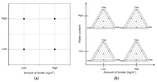 An example of a -factor experiment with binder quantity and water ratio as factors (a); An example of a -factor trial in combination with simplex trials (b).