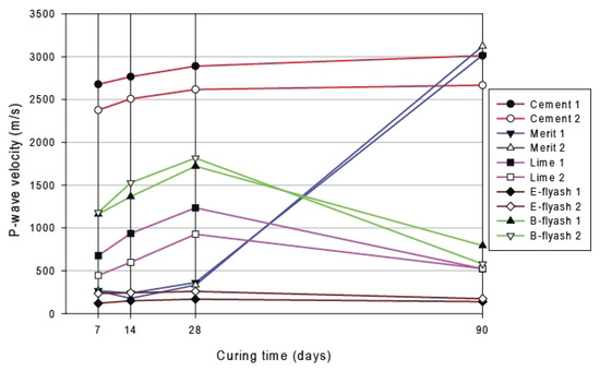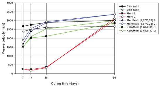 P-wave velocity as a function of curing time for individual binders.