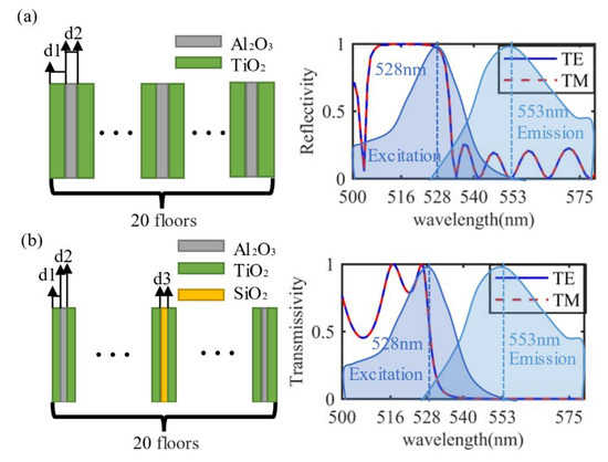 We assume that the layer of the fluorescent solution was about 3.18 um thick, and the refractive index of Rhodamine 6G was nearly 1.593 at 553 nm and 1.4 at 528 nm [37,38]. After the genetic algorithm-assisted design, we finalized the photonic crystal parameters, as shown in Figure 1a,b, and the transmittance and reflectance of the corresponding two photonic crystals for the excitation wavelength vicinity. It can be found that the backward photonic crystal has a high transmittance near the excitation wavelength of 528 nm, while the forward photonic crystal has a high reflectance.