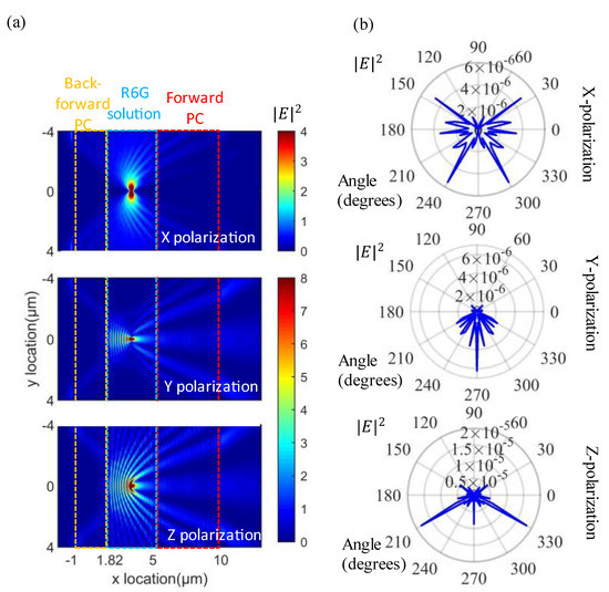 Next, we explored the emission process, as shown in Figure 3a; since the electric dipole has three polarization directions, we calculated the distribution of the electric field mode squared under three polarizations at the center of the layer of the fluorescent solution. We can find that our backward photonic crystal has good reflection regardless of the polarization, and this photonic crystal reflects best at small angles. We tested the far-field radiation map of the structure with the same simulation area size, as shown in Figure 3b. We can find that the structure has good directionality and backward photonic crystal reflection under y and z polarization. Still, the backward photonic crystal had poor reflection under x polarization due to the large difference of electric dipole electric field distribution with y and z polarization distribution modes. But all in all, our structure had some light field directionality during emission.