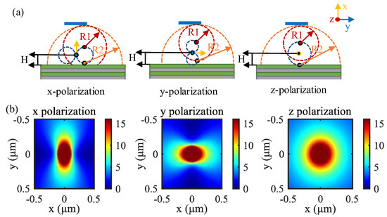 Analysis of the enhancement effect at different positions of fluorescent molecules. (a) Schematic diagram of the enhancement effect using the Huygens-Fresnel principle under three polarizations; (b) electric field intensity distribution under three polarizations.