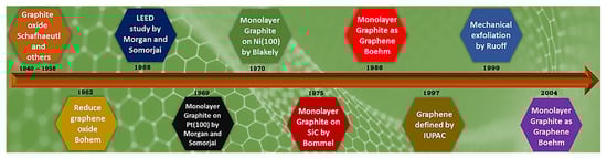 The scientific community around the globe working on material research is overwhelmed by the research focused on carbon-based nanomaterials, and the emphasis is particularly on the fabrication, characterization, and real-word applications of extremely thin carbon films, where graphene tends be the thinnest and therefore most explored carbon-based nanomaterial [1,2,3]. Graphene consists of individual layers of graphite, where graphite has shown fascinating characteristics and properties with a long history in many disciplines, particularly in engineering, physics, chemistry, and material science [4]. British Chemist B.C. Brodie and German scientist Schafhaeutl were the first to successfully isolate individual flakes of graphite through intercalation in mid-19th century [5,6]. In the late 1940s, P.R. Wallace suggested several extraordinary electronic and mechanical properties for individual graphite flakes through theoretical analysis [7]. Materials similar to graphene derived from graphite oxide were first described by Boehm et al. in 1962 in a diluted alkaline solution, with hydrogen sulphide, hydrazine, or iron salts utilized as the reducing agents [8]. Nearly 40 years later, in 2004, Geim and Novoselov used a micromechanical method and succeeded in producing extremely thin flakes of carbon from highly ordered pyrolytic graphite (HOPG), winning the Nobel prize in physics in 2010 [9,10]. A chronological arrangement of specific events in the history of synthesis, separation, and characterization of graphene is displayed in Figure 1 restructured from [4].