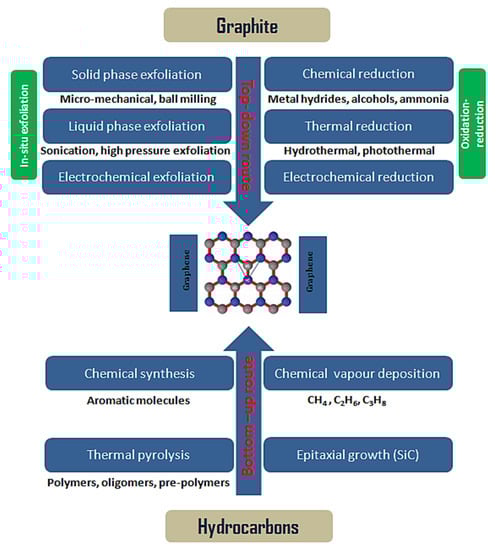 There are two key graphene synthesis routes, and they can be categorized as (i) top-down and (ii) bottom-up techniques and are schematically represented in Figure 3. In top-down methods, bulk material such as graphite is transformed into its smallest constituents to produce graphene [11]. Some of the major top-down techniques include [47] liquid-phase exfoliation [48], plasma etching [49], electrochemical exfoliation [50], laser ablation [51], ball milling [52], and chemical reduction [53]. Conversely, in the bottom-up synthesis route, graphene is produced through the decomposition of carbon-containing precursors (both gaseous and liquid) followed by the formation of a hexagonal structure of graphene layers [54]. Chemical vapor deposition (CVD) [55], thermal pyrolysis [56], and epitaxial growth [57] are some of the focal bottom-up approaches frequently used for the production of graphene. Frequently adopted production methods using both top-down and bottom-up strategies will be reviewed briefly in the sub-sections below.