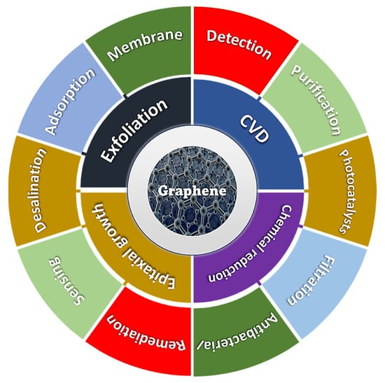 The rapid industrialization and modernization of transport infrastructure and the urbanization of countries have resulted in increased air pollution, with subsequent environmental impacts [30]. This occurs through the discharge of harmful compounds (gaseous, liquid, and solid) such as CO2 [31], CH4 [32] heavy metals [33], dyes [34], pesticides [35], and many other volatile organic compounds (VOCs) into the environment [33]. Release of these harmful pollutants not only damages the surrounding environment through water contamination, air pollution, global warming, and depletion of the ozone layer but also effects human health directly [21]. Therefore, the accurate detection and efficient elimination of these pollutants is mandatory to achieve environmentally friendly and sustainable growth. A diverse range of nanomaterials including carbons, metal organic frameworks, and conducting polymers have been utilized for a number of environmental applications to reverse the aforementioned trends [36,37,38,39]. Graphene, its derivatives, and hybrids are also being developed for adoption in a wide range of environmental applications including membranes for water treatment, high-porosity adsorbents for decontamination applications, and active materials for contamination-monitoring sensors [40]. Numerous research studies have been conducted on the synthesis and applications of graphene [41,42]. Literature is widely available on both bottom-up and top-down synthesis techniques of graphene [43]. Similarly, extensive literature is available on the applications of graphene in general and environmental applications in particular [3,44,45,46]. However, the availability of literature covering both the synthesis and environmental applications of graphene, its derivates, and hybrids is very limited. Therefore, this review will address both the production and environmental applications of graphene and will be distinctive from other previous studies in this area. The various synthesis methods and environmental applications of graphene are summarized in Figure 4.