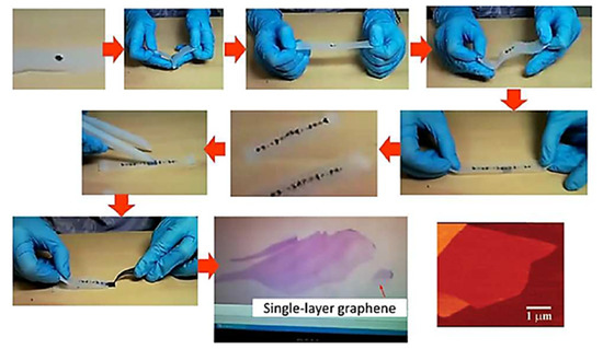 Mechanical exfoliation includes a number of top-down strategies such as micromechanical cleavage, ball milling, sonication, intercalation, and liquid-mediated exfoliations to produce graphene. The micromechanical cleavage method has been widely used to produce monolayers of the best-quality graphene with lateral dimensions in the µm scale. Novoselov et al. were the first to employ micromechanical cleavage, also known as the Scotch tape technique, to separate few-layer graphene flakes from a piece of HOPG in 2004, earning them the Nobel prize in physics in 2010 [9,66]. The different steps of graphene synthesis using this procedure are shown below in Figure 6.