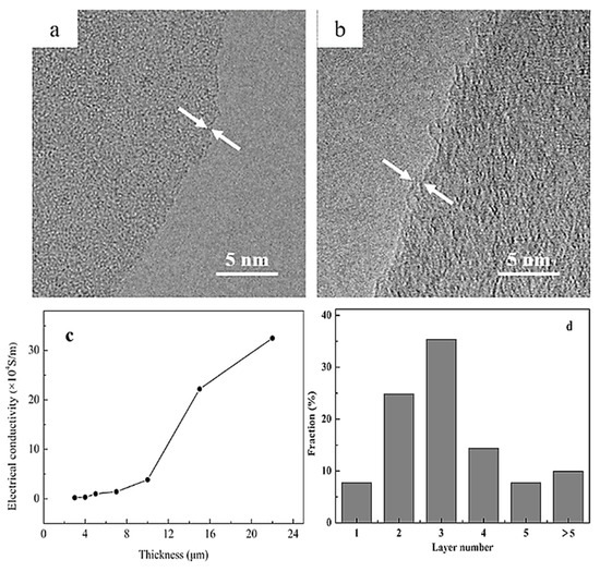 HR-TEM micrographs of (a) single-layer and (b) double-layer graphene; (c) electrical conductivity vs. sample thickness; and (d) presentation of graphene % in the form of histogram as a function of number of layers counted using AFM. Adopted with permission from [75].