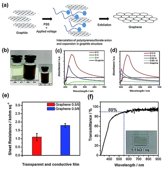 This method can also provide a cleaner, greener, and environmentally friendlier route to produce good-quality graphene from recycled graphite such as electrodes of spent batteries. Prakoso and co-workers used rods of graphite of spent Zn–C batteries and produced excellent-quality graphene with high transmittance of approximately 89% and low sheet resistance of 1.1 kΩ sq−1, and these characteristics of prepared graphene are analogous to those obtained by more complicated and energy-intensive techniques such as CVD. The complete synthesis procedure and various characteristics of the graphene produced by this technique are presented in the Figure 10 [81]. Figure 10a displays the schematic of the graphene production process, Figure 10b shows a 0.5 M PSS solution, whereas Figure 10c,d show the UV-vis spectra at varying and 8V DC voltage, respectively. Figure 10e,f show the sheet resistance and transmittance of the produced graphene.