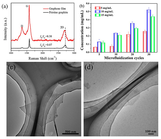 (a) Raman spectra of as-prepared graphene and pristine graphite; (b) concentration of graphene with the number of microfluidization cycles; and (c,d) TEM micrographs after 20 and 30 microfluidization cycles, respectively. Adopted with permission from [88].