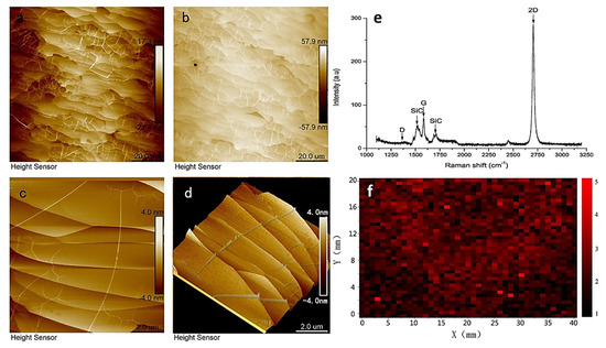 Although epitaxial growth is considered one of the best methods to produce large-area graphene, the application of an ultra-high vacuum (UHV) makes it extremely challenging to control the thickness of the layers of graphene. Moreover, the high sublimation rate of Si atoms results in creating a large number of defects, especially on C-face of the SiC substrtate, ultimately filling it with carbon. To address the issue of UHV and uncontrolled growth of the graphene layer, Zhao et al. recently adopted a new synthesis strategy to produce good-quality, large-sized graphene under a low-vacuum environment [95]. This method not only reduces the production cost, but also controls the growth rate of graphene on the SiC substrate. Several characteristics of graphene prepared by this method are shown in Figure 13. Atomic force microscope (AFM) images in Figure 13a,b show the formation of a continuous layer of graphene. Figure 13c,d display surface topographies in detail in 2D and 3D, measured at the same spot as AFM images. It is evident from Figure 13c that terraces of epitaxial graphene are exceptionally consistent and homogeneous, whereas Figure 13d shows the formation of nanometer-scale steps on the entire layer of graphene. Figure 13e shows typical Raman spectra of graphene produced through epitaxial growth on the SiC substrate, and finally, Figure 13f illustrates the Raman mapping to confirm the uniformity of graphene layers, where the ratio of 2D and G bands (I2D/IG) is greater than two in the entire region and is in line with the ratio of monolayer graphene [95].