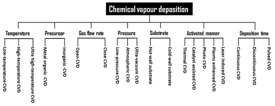CVD is a bottom-up technique and is by far the most adopted procedure to prepare good-quality graphene, with potentially large quantities of monolayer and few-layer graphene. In this method, graphene can be s synthesized by either the deposition of vapors from carbon containing gases such as CH4 and H2 on metal/dielectric surfaces or through the surface separation of carbon from metal/carbon solutions. There are a number of factors such as the reactor configuration, gas feedstock, gas ratios, partial pressure of gasses, temperature, growth time, and reactor pressure, which govern the type of processes and chemical reactions taking place inside a CVD reactor [96]. CVD deposition was first reported in 1966 where a crystalline graphite film was thermally deposited on a Ni substrate; this was followed by single-layer deposition of graphite by the CVD technique, where the Pt surface was used as the substrate and hydrocarbon decomposition as the source [97,98]. This technique has seen huge interest after the separation of single-layer graphene in 2004, which resulted in wider production and applications of graphene and graphene-based composites. A large number of chemical CVD methods are being developed and used. These synthesis methods are governed by characteristics of seven main preparation parameters, namely, the nature of the precursor, temperature, pressure, mix of gases, type of substrate, deposition time, and gas flow rate [99,100], which are shown in Figure 14 [96].