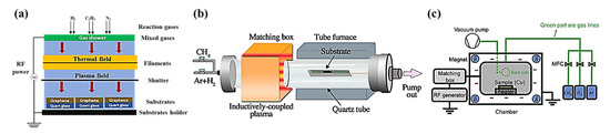 The benefit of combining radio frequency with hot filament results in avoiding the annealing step, while graphene is directly deposited on a substrate such as Ni [104] as shown in (a), whereas inductively coupled plasma systems as shown in (b) can be coupled with an inductive circuit element, which results in high growth rates of graphene [105]. Finally, (c) shows the capacitively coupled plasma, which is a simpler setup when compared with other techniques such as ICP, while it is also less energy-intensive; however, this can result in the formation of amorphous layers [106].