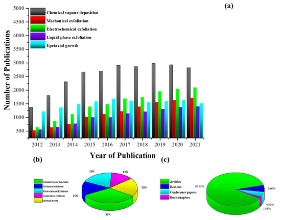 As can be observed from Figure 16a,b, CVD is by far the most researched and used technique when compared with other techniques, since this bottom-up method can result in the production of high-quality (low defects), large-sized graphene with a controlled number of layers. CVD has seen sustained growth up until 2019, with aa slight decrease in both 2020 and 2021, which may be due to the necessity of finding alternative techniques that are green and more sustainable. Alternative top-down techniques such as liquid phase and electrochemical exfoliation have seen steady growth over recent years since, by using electrochemical exfoliation, good-quality graphene can be produced using a simpler and more eco-friendly synthesis procedure at a much lower cost; however, this technique still faces various challenges including slight oxidation and non-uniform thickness of produced graphene. Similarly, liquid-phase exfoliation is another very promising technique, which has seen increased use recently and can be used to cost-effectively produce graphene at a larger scale; however, this top-down technique is time consuming and produces predominantly few-layer graphene. It can be seen from Figure 16c that most of these research publications are comprised of experimental articles, making graphene synthesis one of the most studied, active, and high-growth area of research.
